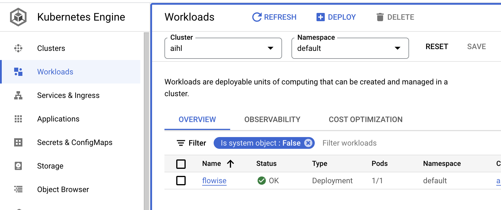 5. Go to `Workloads` in the GCP, you can see your pod is running.