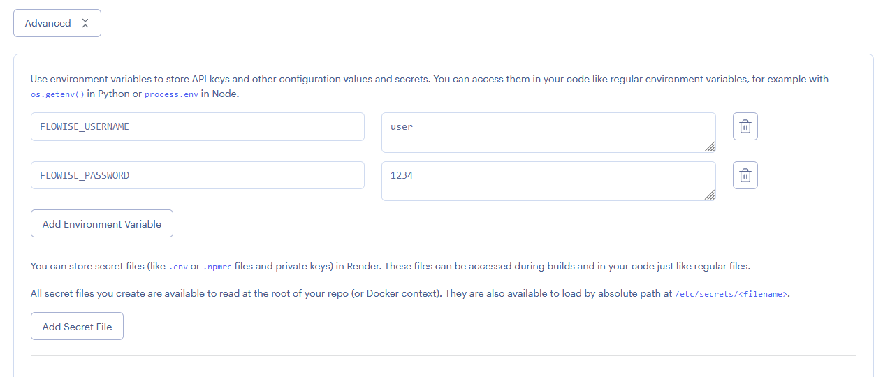 * SECRETKEY\_PATH - `/opt/render/.flowise`