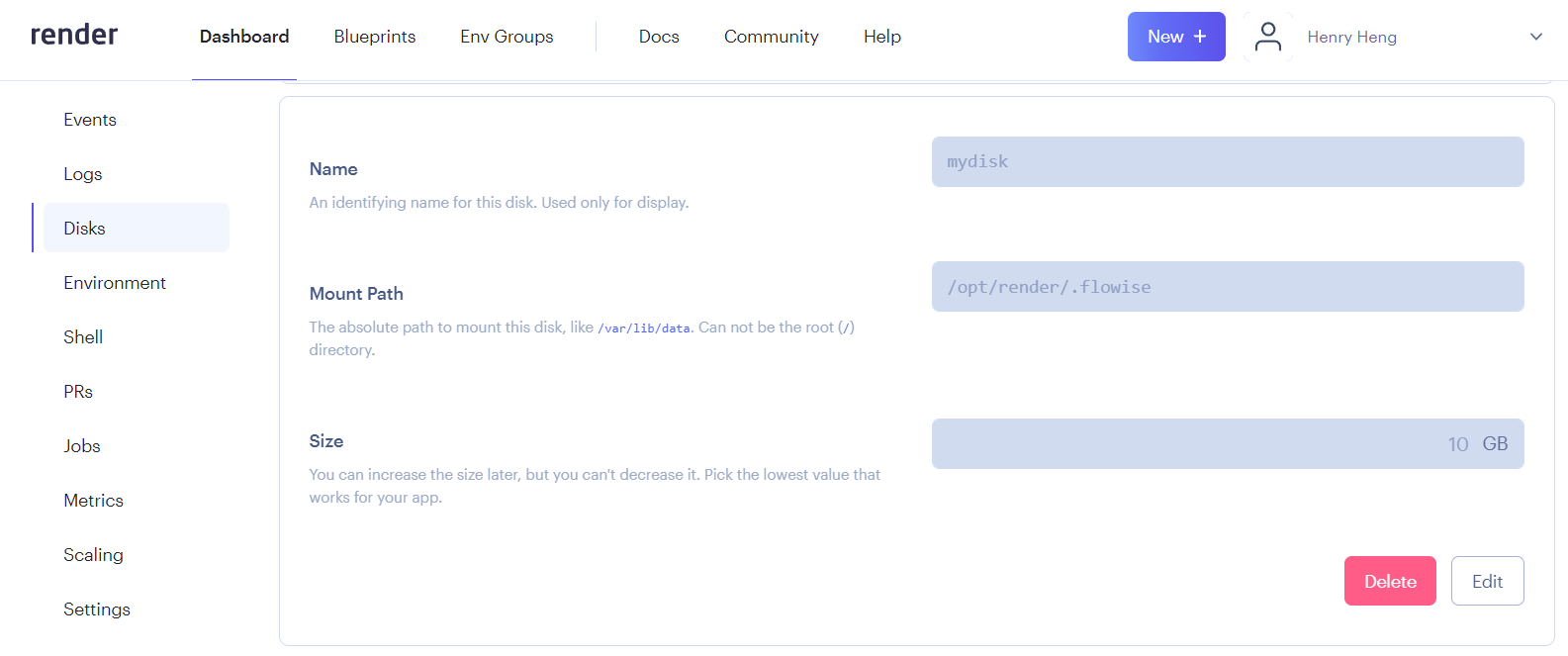 2. Name your disk, and specify the **Mount Path** to `/opt/render/.flowise`