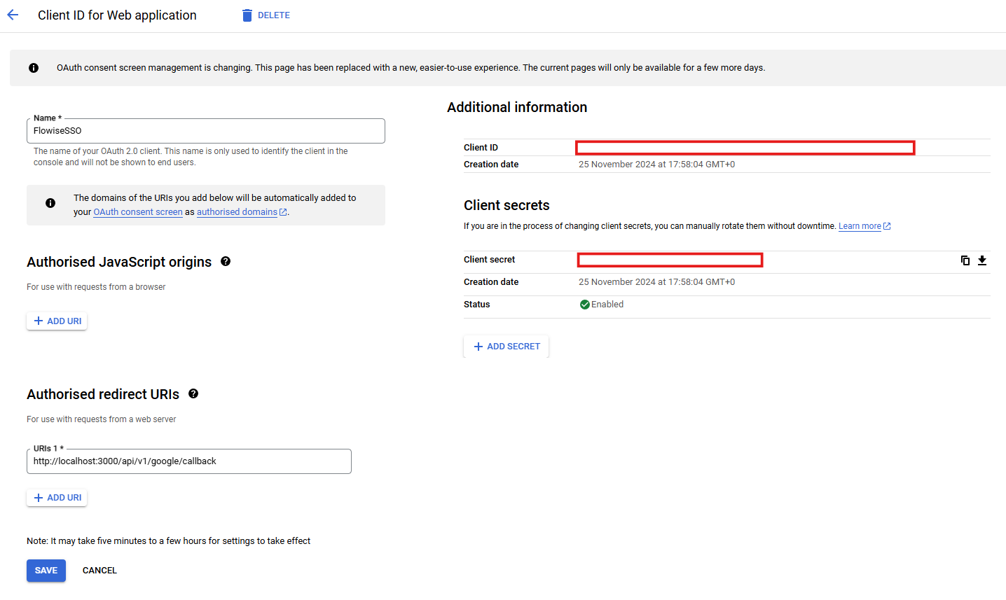 6\. Back to Flowise app, add the Client ID and secret. Test the connection and Save it.