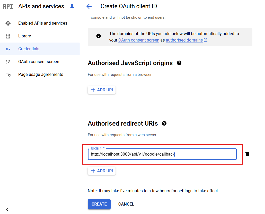 4\. Fill in the redirect URIs. This will need to be changed depending on how you are hosting it: `http[s]://[your-flowise-instance.com]/api/v1/google/callback`: