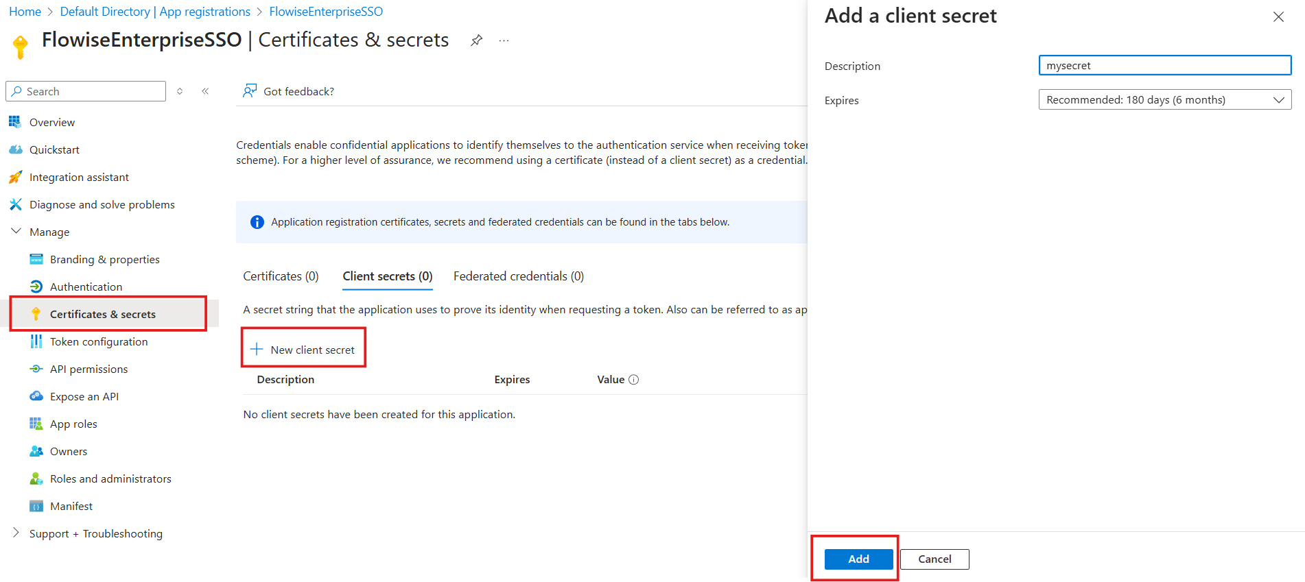 5. On the left side bar, click Certificates & secrets -> New client secret -> Add:
