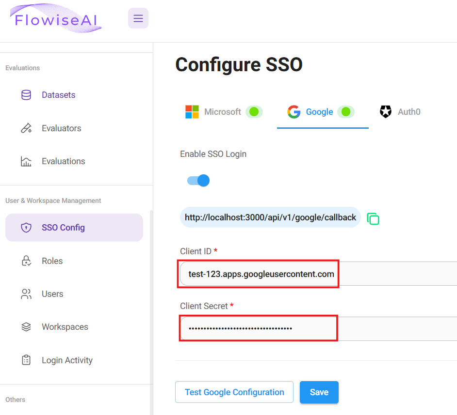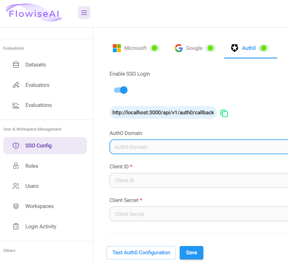 6\. Back to Flowise App, fill in the Domain, Client ID and Secret. Test and Save the configuration.