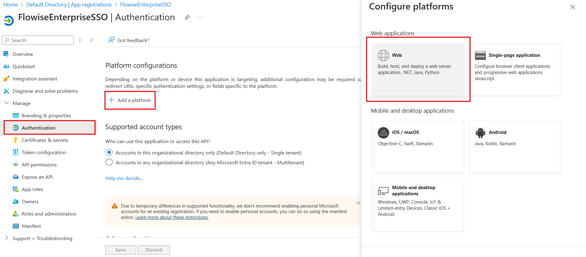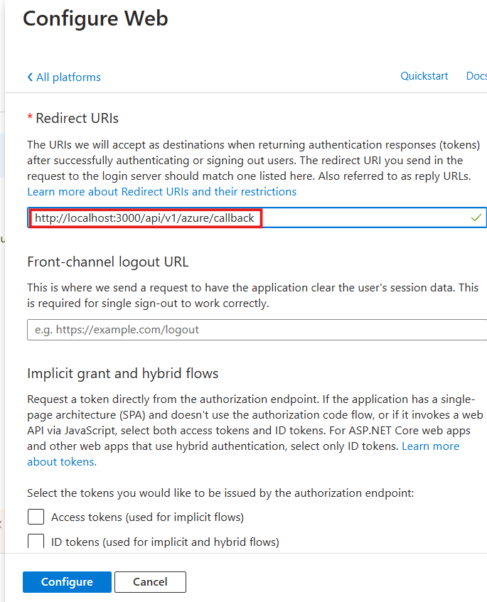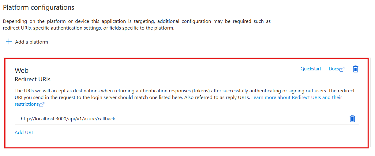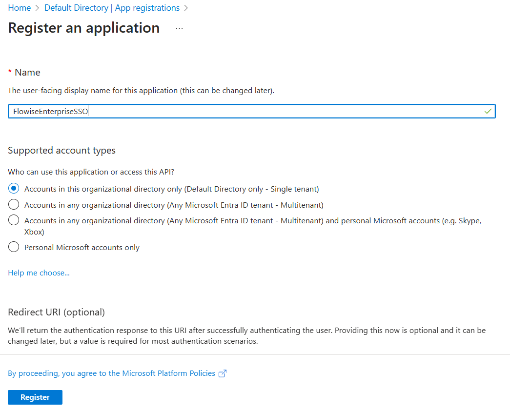 8. Fill in the redirect URIs. This will need to be changed depending on how you are hosting it: `http[s]://[your-flowise-instance.com]/api/v1/azure/callback`: