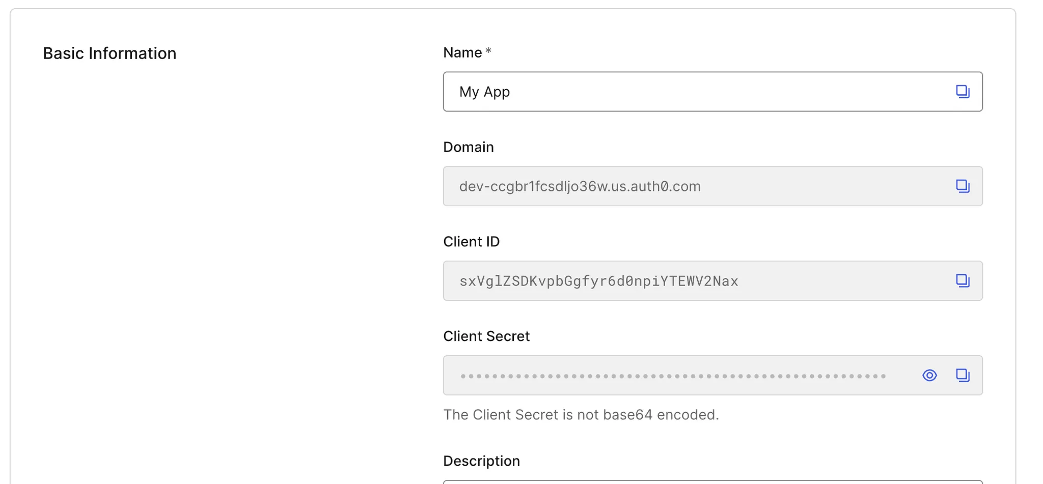 3. Configure the fields such as Name, Description. Take notes of the **Domain**, **Client ID**, and **Client Secret**.