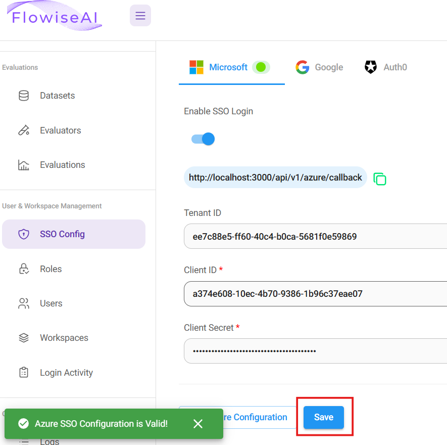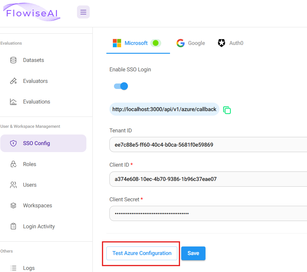 10. Back to Flowise app, login as Organization Admin. Navigate to SSO Config from left side bar. Fill in the Azure Tenant ID and Client ID from Step 4, and Client Secret from Step 6. Click Test Configuration to see if the connection can be established successfully: