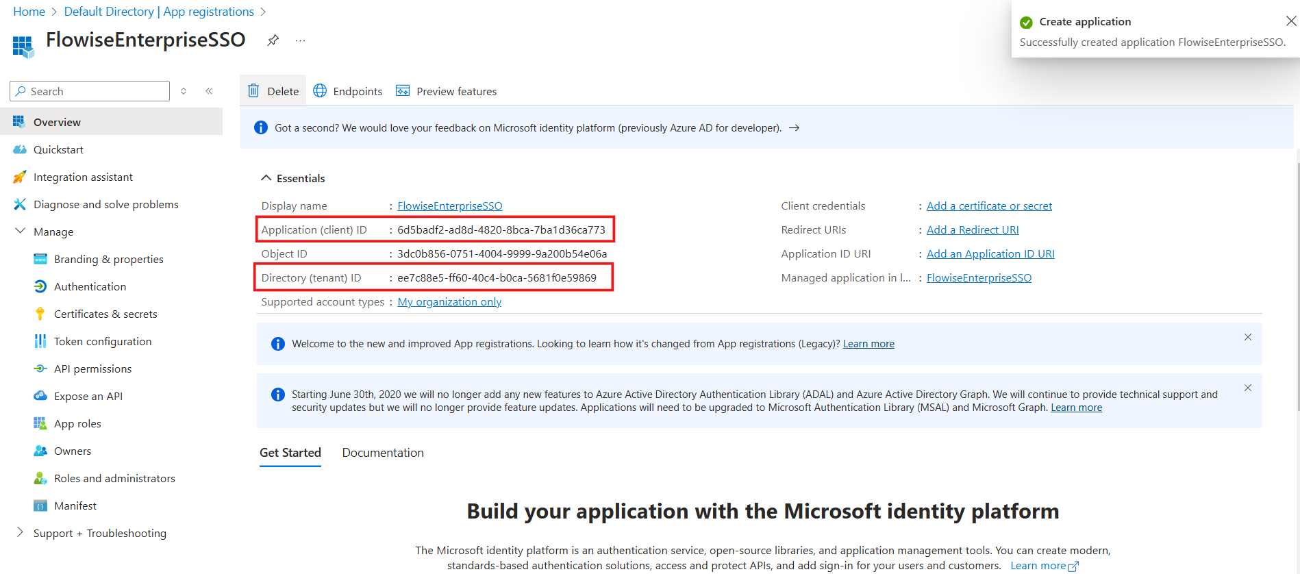 4. After an app is created, note down the Application (client) ID and Directory (tenant) ID: