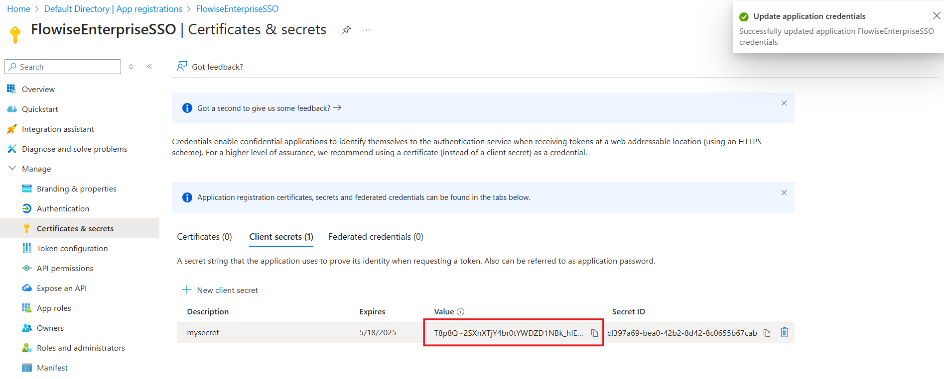 6. After the secret has been created, copy the Value, <mark style="color:red;">not</mark> the Secret ID: