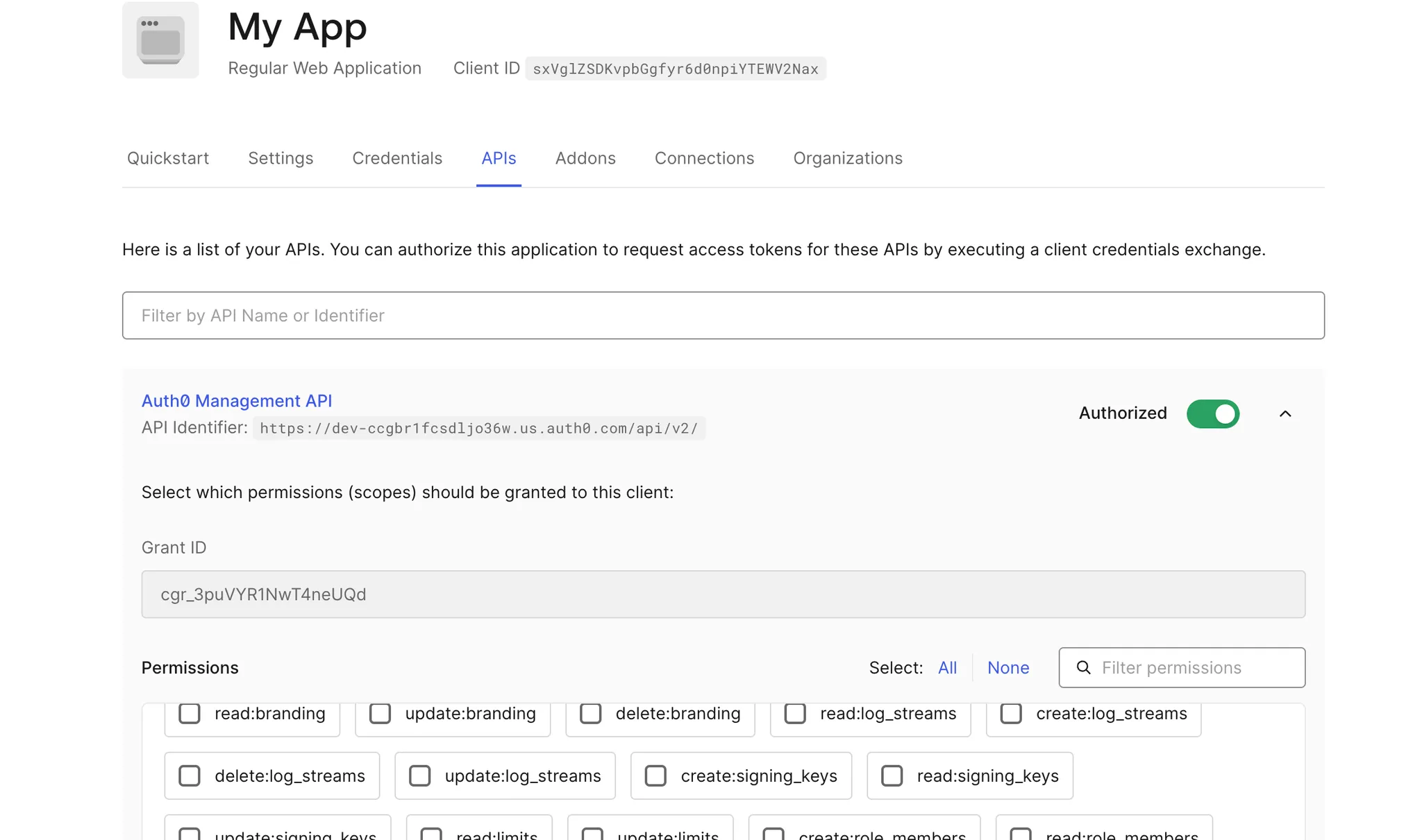 5. In the API’s tab, ensure that Auth0 Management API is enabled with the following permissions
