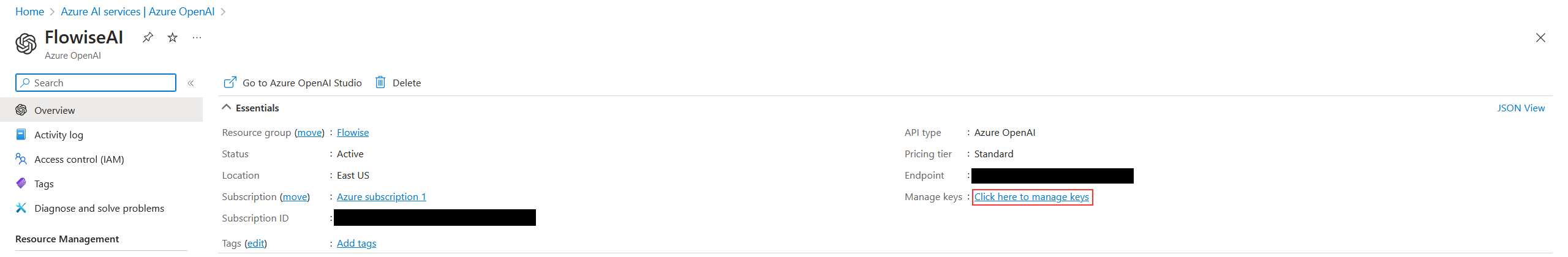 3. Tu API key estará disponible en **Azure OpenAI** > haz clic en **name\_azure\_openai** > haz clic en **Click here to manage keys**