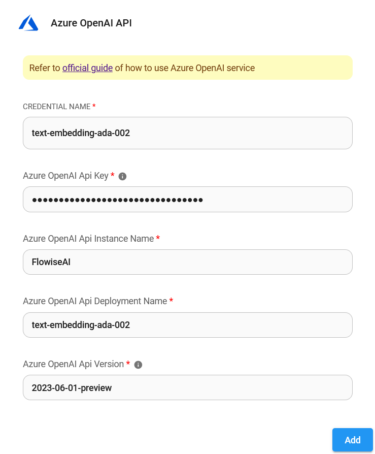 3. Copia y pega cada detalle (API Key, Instance y Deployment name, [API Version](https://learn.microsoft.com/en-us/azure/ai-services/openai/reference#chat-completions)) en la credencial de **Azure OpenAI Embeddings**