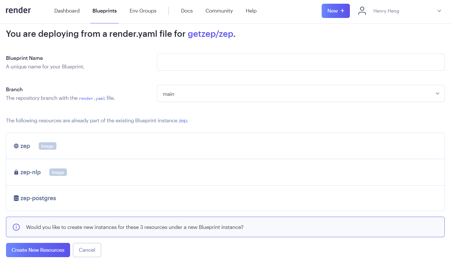 2. Esto te llevará a la página Blueprint de Render y simplemente haz clic en **Create New Resources**