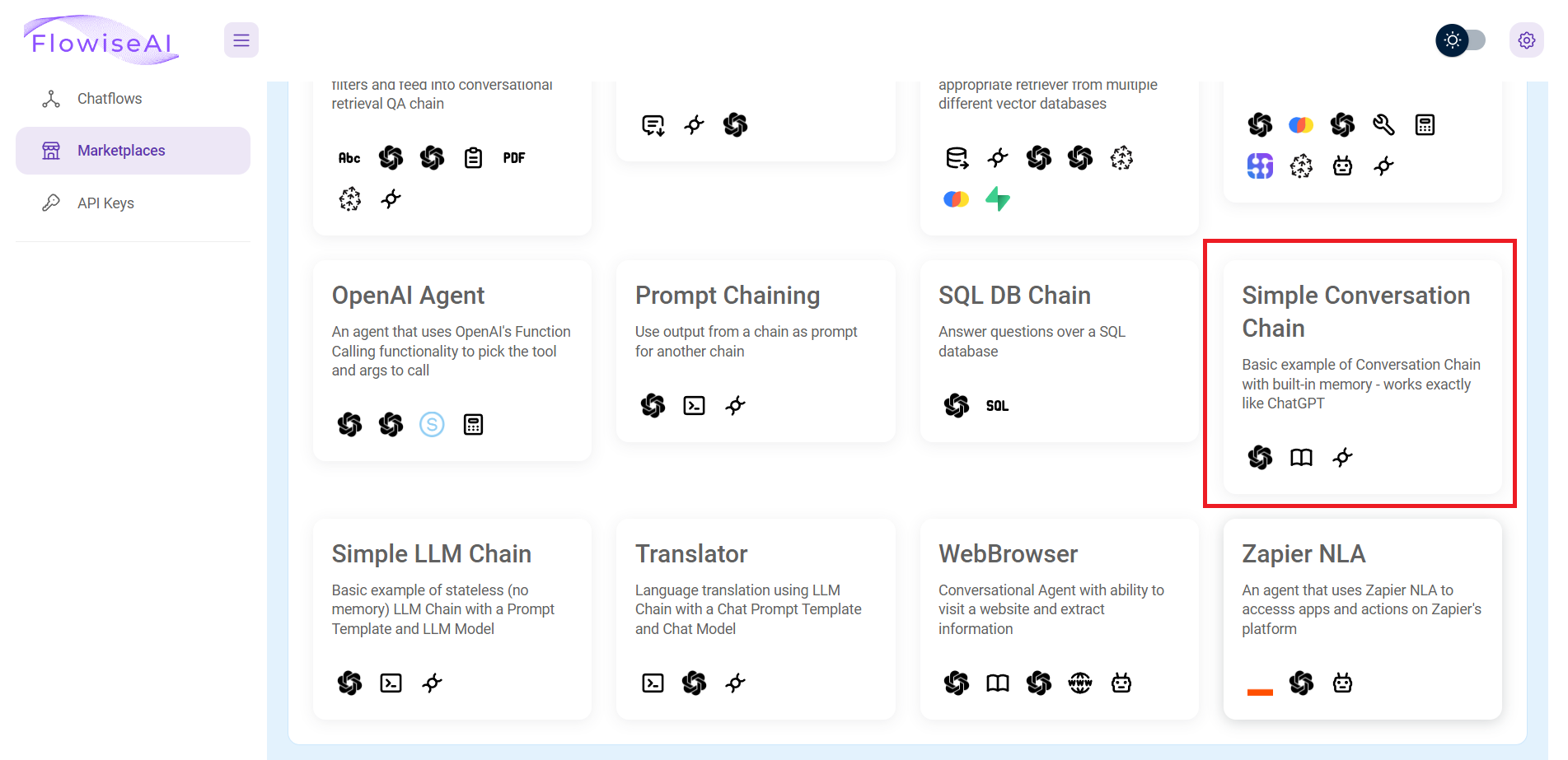 1. De vuelta en la aplicación Flowise, simplemente crea un nuevo lienzo o usa una de las plantillas del marketplace. En este ejemplo, vamos a usar **Simple Conversational Chain**