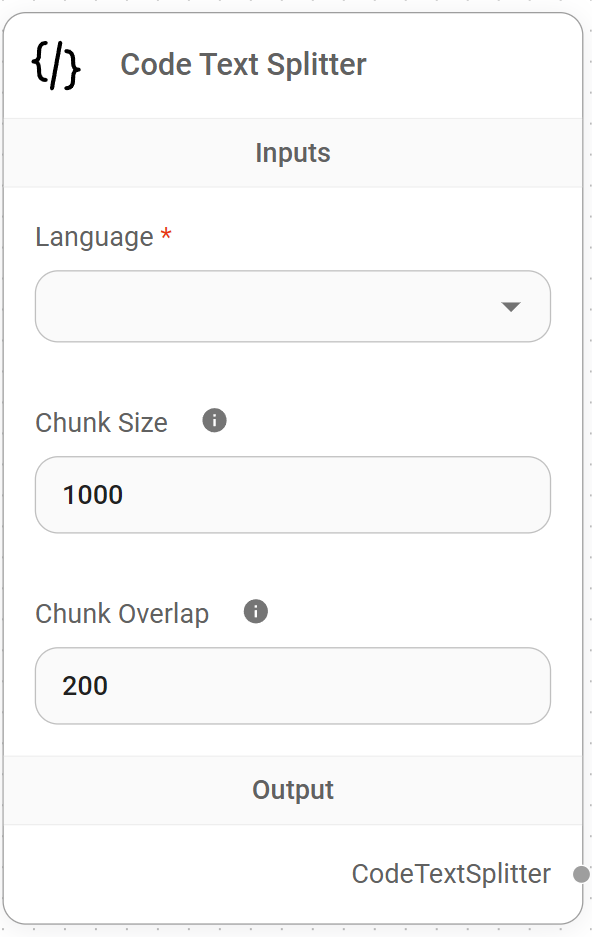 <figure><img src="https://4068692976-files.gitbook.io/~/files/v0/b/gitbook-x-prod.appspot.com/o/spaces%2FUiD7nOmFRK805sNuiieJ%2Fuploads%2Fgit-blob-756d00fd7880e25c80f7167c1a73dcb0349341b1%2Fimage%20(151).png?alt=media" alt="" width="296"><figcaption><p>Nodo Code Text Splitter</p></figcaption></figure>