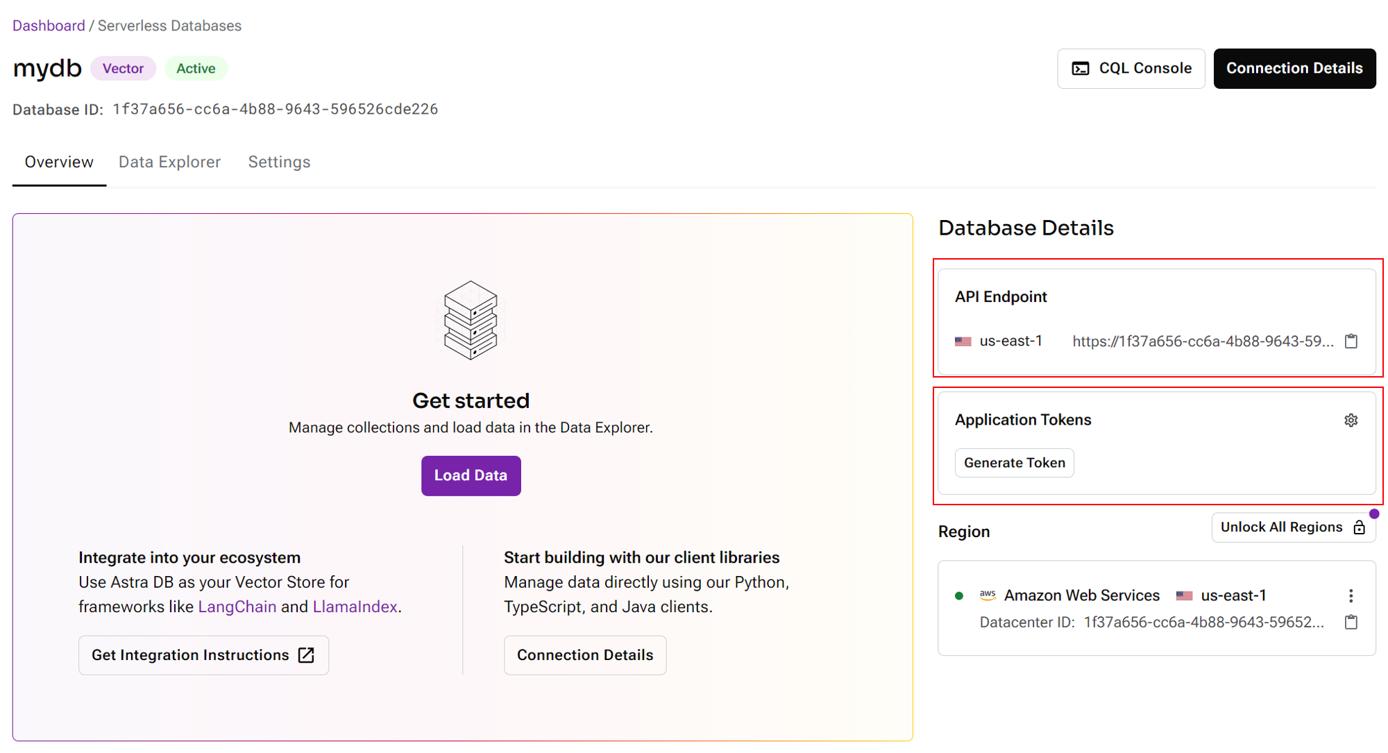 4. Después de que la base de datos haya sido configurada, obtén el API Endpoint y genera un Application Token