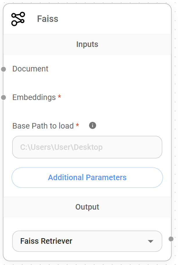 <figure><img src="https://4068692976-files.gitbook.io/~/files/v0/b/gitbook-x-prod.appspot.com/o/spaces%2FUiD7nOmFRK805sNuiieJ%2Fuploads%2Fgit-blob-8f1b1956a66a6df49f9afdcb7ba5addda0dd6db5%2Fimage%20(158).png?alt=media" alt="" width="307"><figcaption><p>Nodo Faiss</p></figcaption></figure>