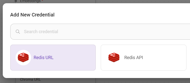 3. Selecciona el tipo de credencial de Redis. Elige Redis API si tienes nombre de usuario y contraseña, de lo contrario elige Redis URL: