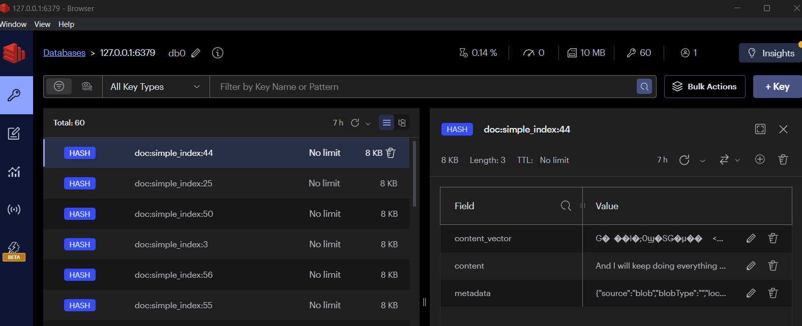 6. Navega al portal de Redis Insight, y en tu base de datos, podrás ver todos los datos que se han insertado: