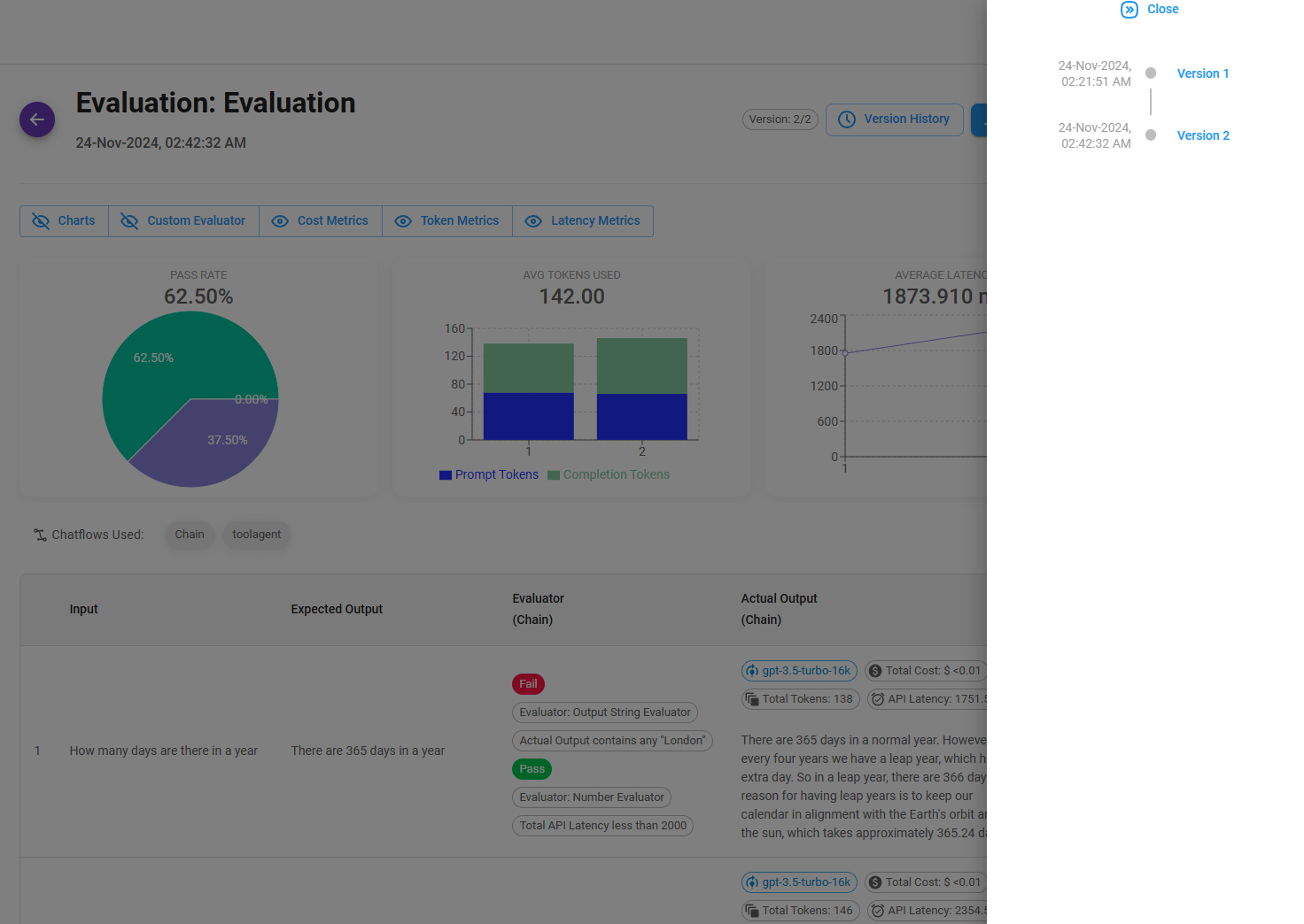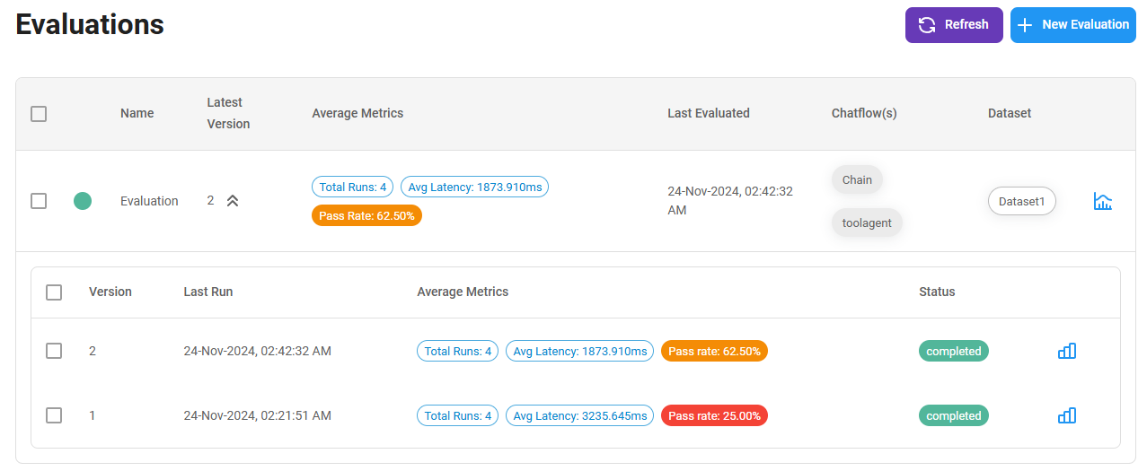 Puedes volver a ejecutar la misma evaluación usando el botón Volver a Ejecutar Evaluación en la esquina superior derecha. Podrás ver las diferentes versiones: