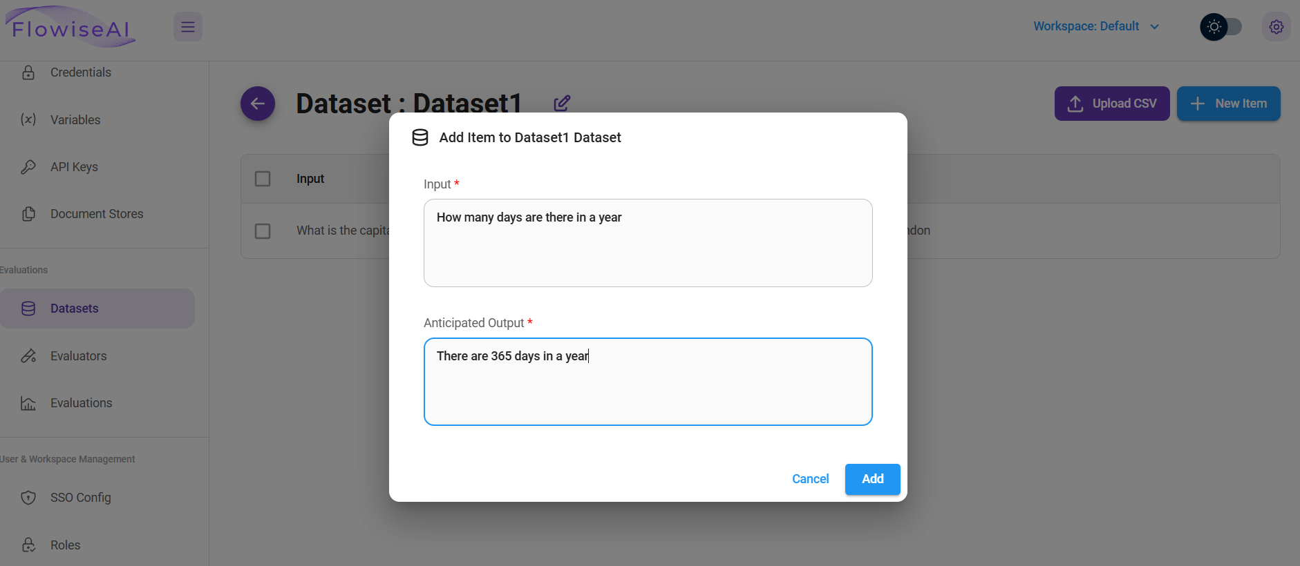 Los conjuntos de datos son las entradas que se utilizarán para ejecutar tu Flujo de Chat/Flujo de Agente, junto con las salidas correspondientes para comparación. El usuario puede agregar la entrada y la salida anticipada manualmente, o cargar un archivo CSV con 2 columnas: Entrada y Salida.