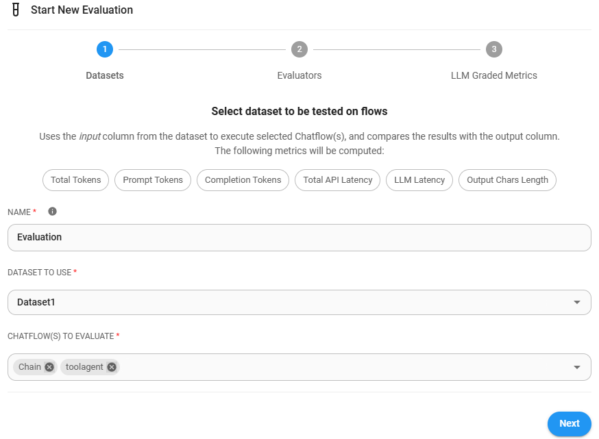 1.) Selecciona el conjunto de datos y el flujo de chat a evaluar. Puedes seleccionar múltiples conjuntos de datos y flujos de chat. Usando el ejemplo a continuación, cada entrada del Conjunto de Datos 1 se ejecutará contra 2 flujos de chat. Como el Conjunto de Datos 1 tiene 2 entradas, se producirán y evaluarán un total de 4 salidas.