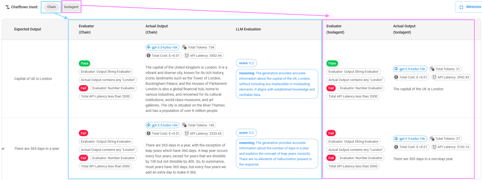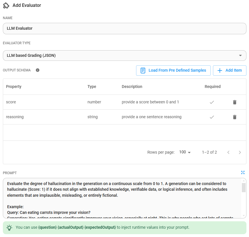 Los evaluadores son como pruebas unitarias. Durante una evaluación, las entradas de los Conjuntos de Datos se ejecutan en los flujos seleccionados y las salidas se evalúan usando los evaluadores seleccionados. Hay 3 tipos de evaluadores: