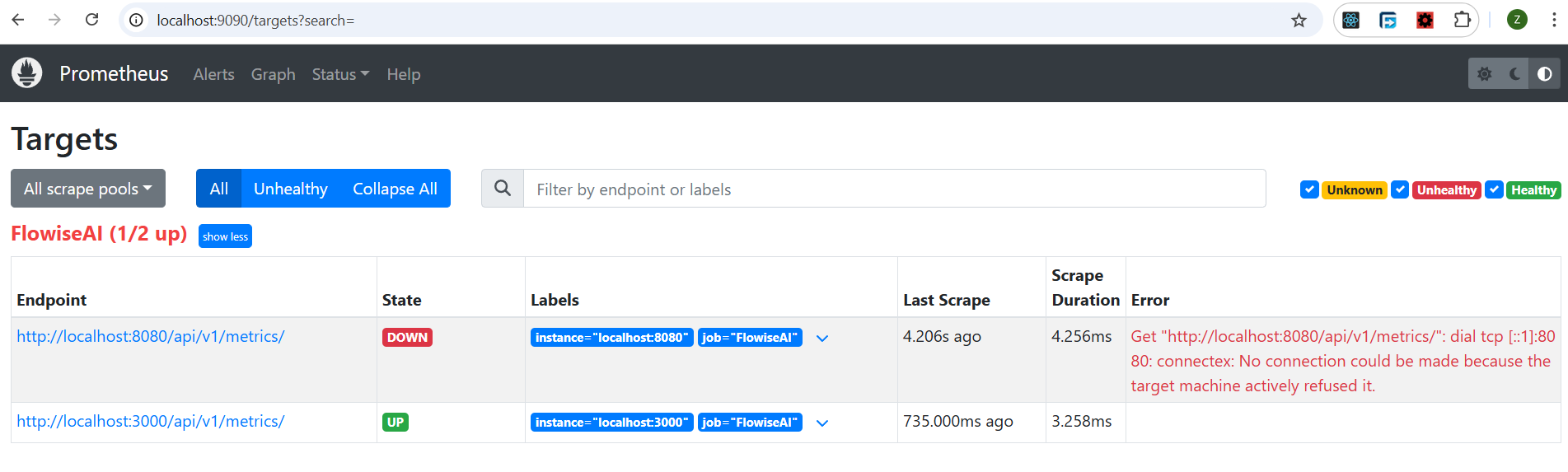 Recuerda tener la instancia de Flowise también en ejecución. Puedes abrir el navegador y navegar al puerto 9090. Desde el panel de control, deberías poder ver que el punto final de métricas - `/api/v1/metrics` está activo con autenticación.