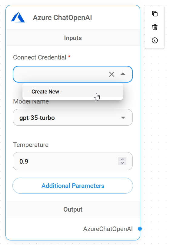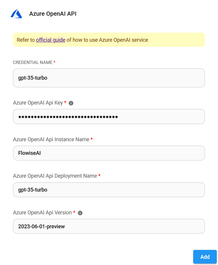 3. Copy & Paste each details (API Key, Instance & Deployment name, [API Version](https://learn.microsoft.com/en-us/azure/ai-services/openai/reference#chat-completions)) into **Azure ChatOpenAI** credential