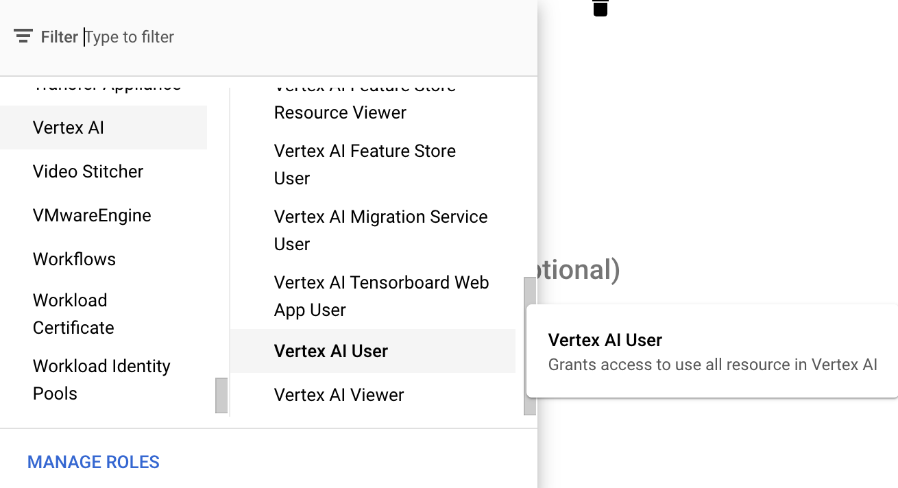 4. Select proper role (for example Vertex AI User) and click **"DONE"**