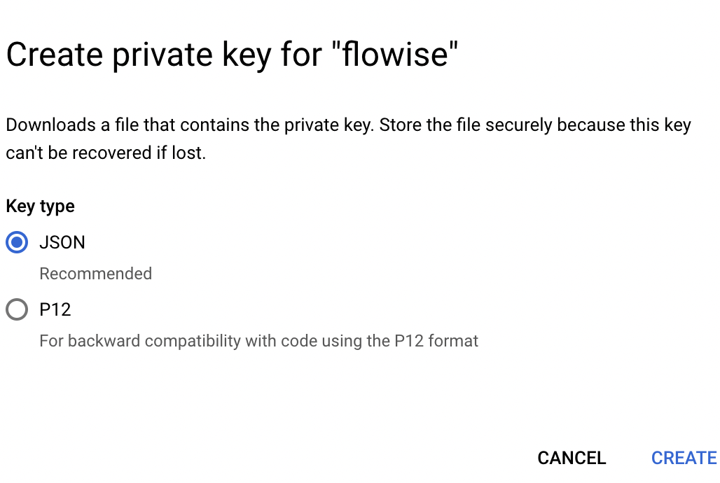 6. Select JSON and click **"CREATE"** then you can download your credential file