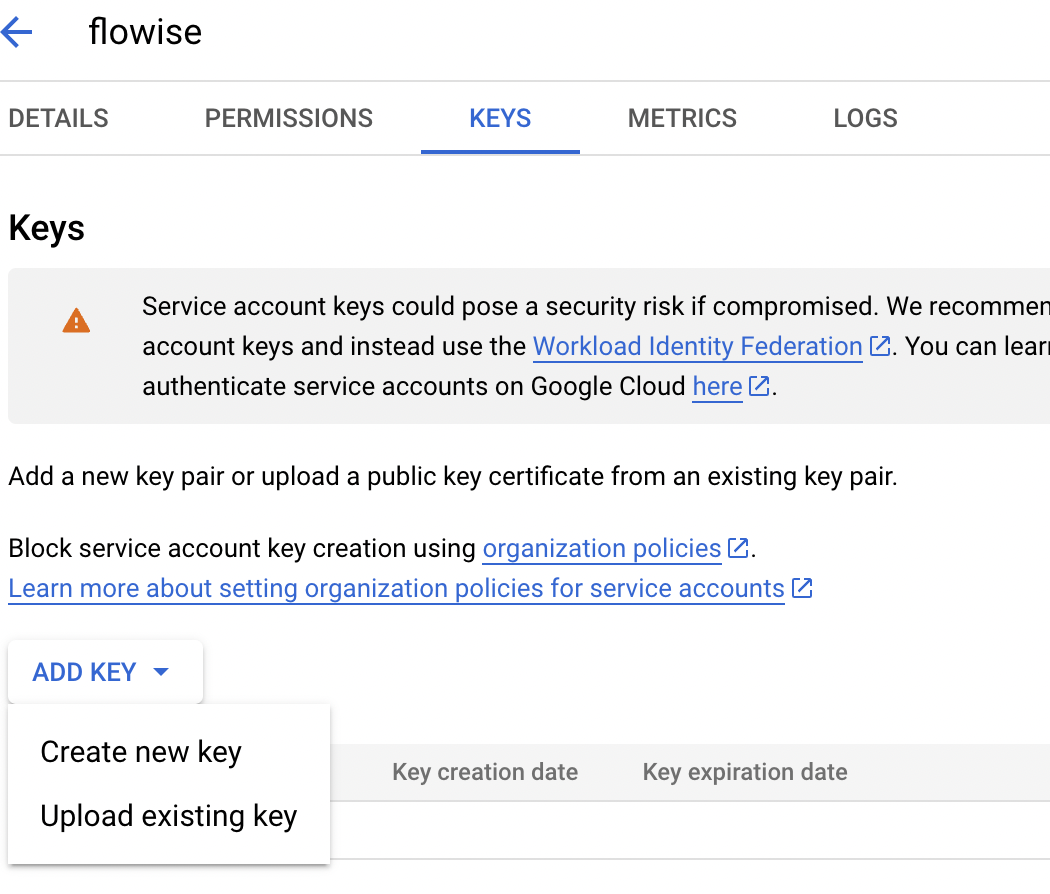 5. Click service account that you created and click **"ADD KEY" -> "Create new key"**