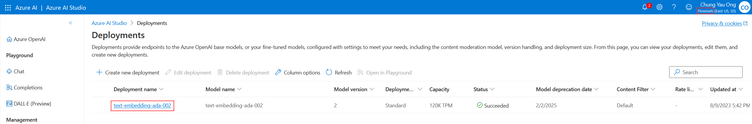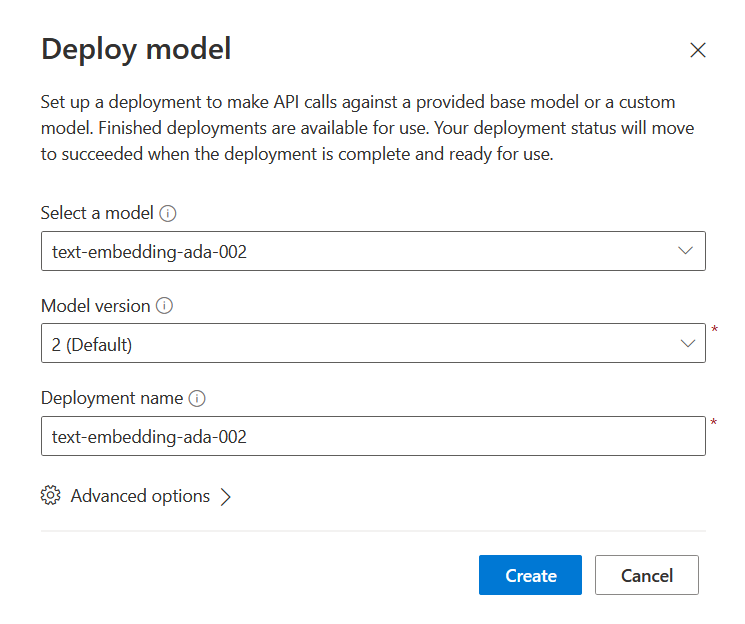 * Deployment name: `text-embedding-ada-002`