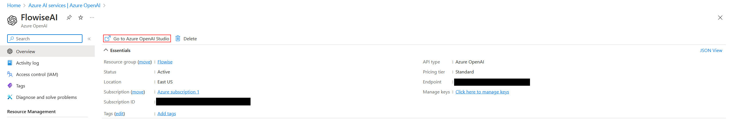 3. Your API key will be available at **Azure OpenAI** > click **name\_azure\_openai** > click **Click here to manage keys**