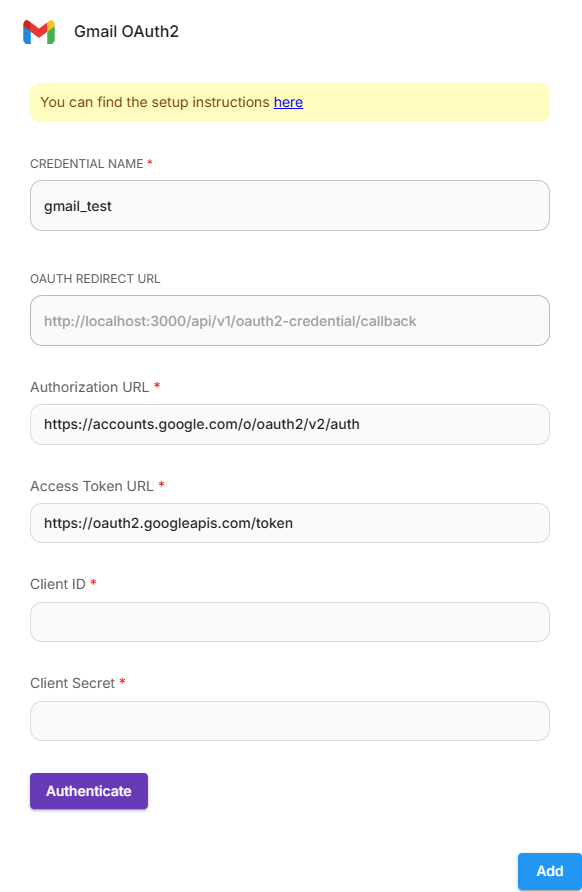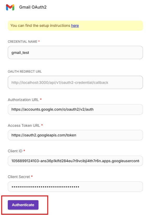 1. Fill in all the values copied earlier. Then click "**Authenticate**":