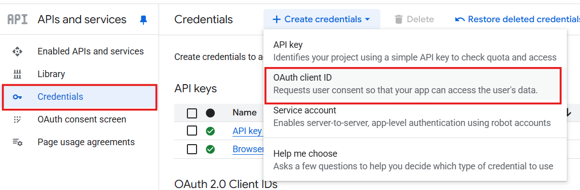 4. Go to **Credentials**, then click **+ CREATE CREDENTIALS > OAuth client ID**.