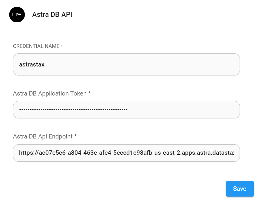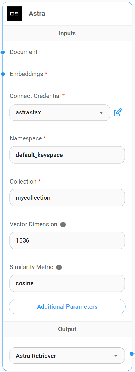 6. Back to Flowise canvas, drag and drop Astra node. Click **Create New** from the Credentials dropdown: