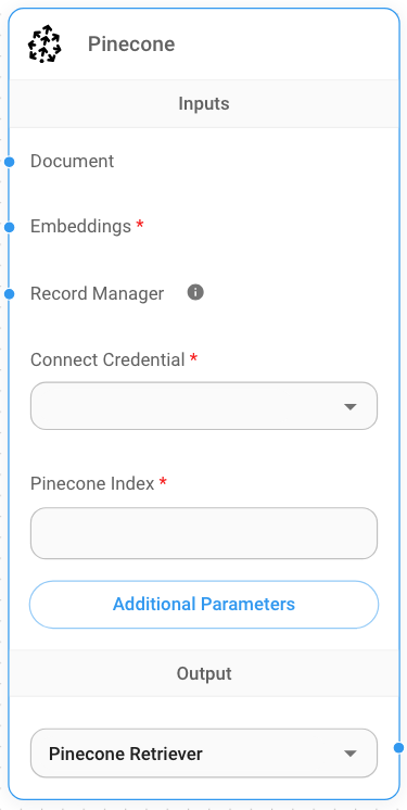 2. Add a new **Pinecone** node to canvas and fill in the parameters: