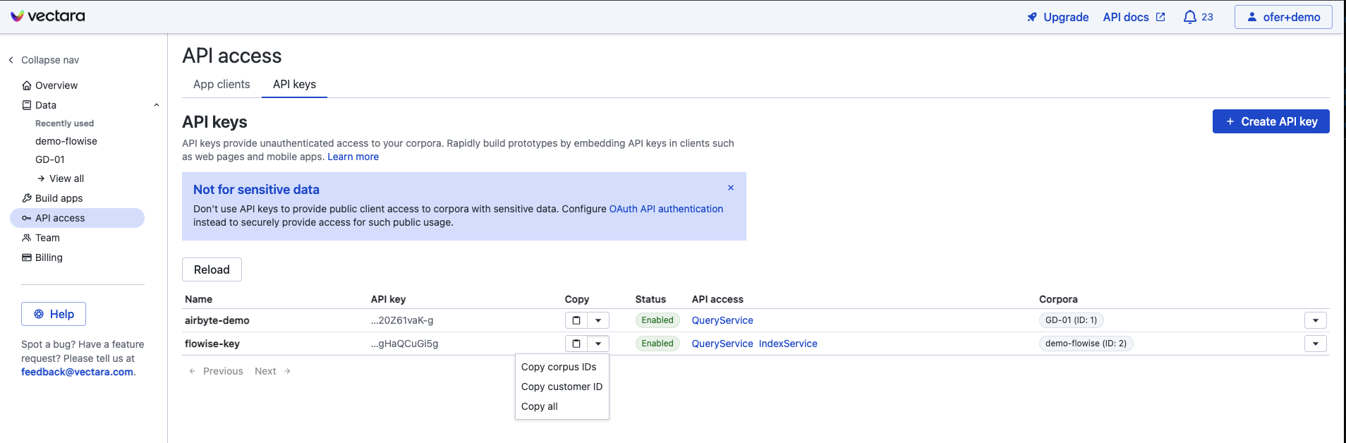 4. Get your **Corpus ID, API Key, and Customer ID** by clicking the down-arrow under "copy" for your new API key: