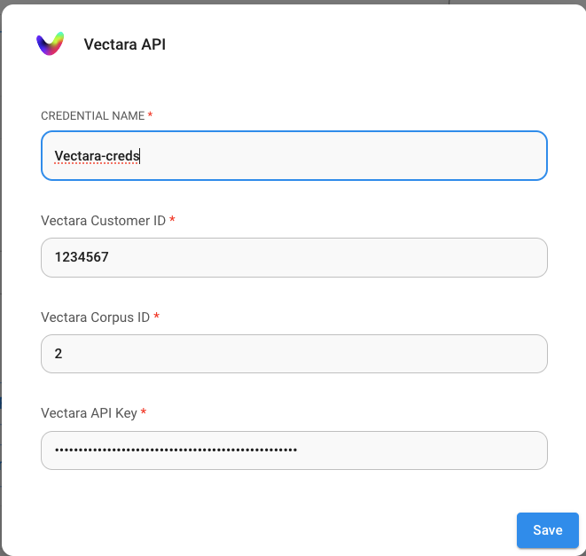 5. Back to Flowise canvas, and create your chatflow. Click **Create New** from the Credentials dropdown ane enter your Vectara credentials.