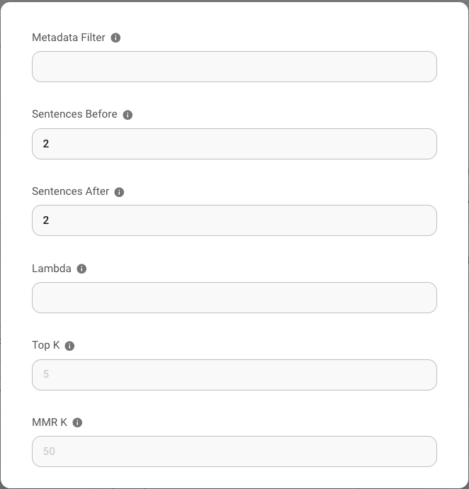 * "Sentences before" and "Sentences after": these control how many sentences before/after the matching text are returned as results from the Vectara retrieval engine
