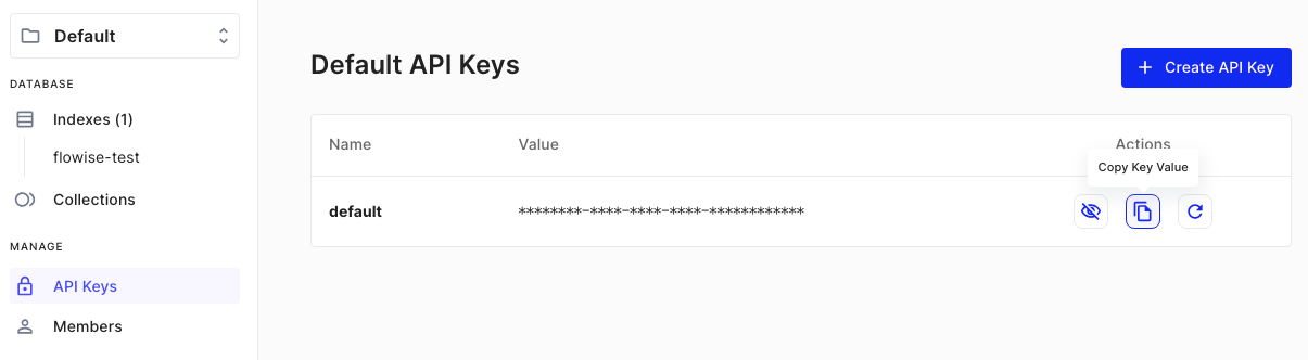 * **Index Name**, name of the index to be created. (e.g. "flowise-test")