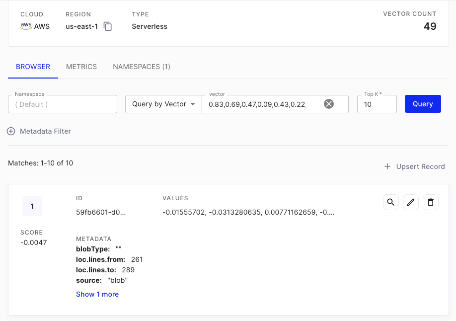5. Verify on [Pinecone dashboard](https://app.pinecone.io) that data has been successfully upserted: