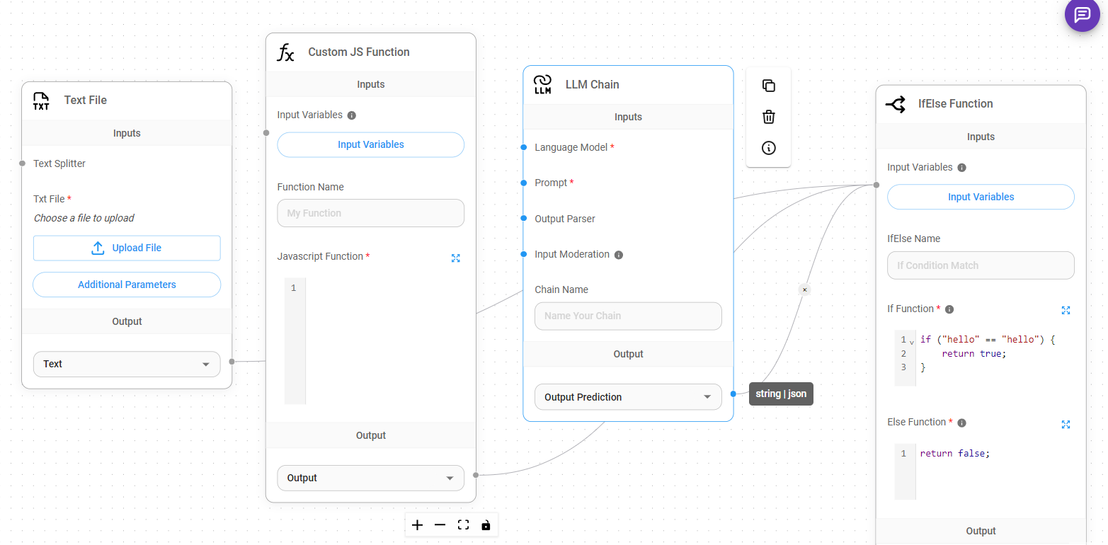 As noticed from the image above, it takes in any nodes that has `json` output. Some examples are: Custom Function, LLM Chain Output Prediction, Get/Set Variables.