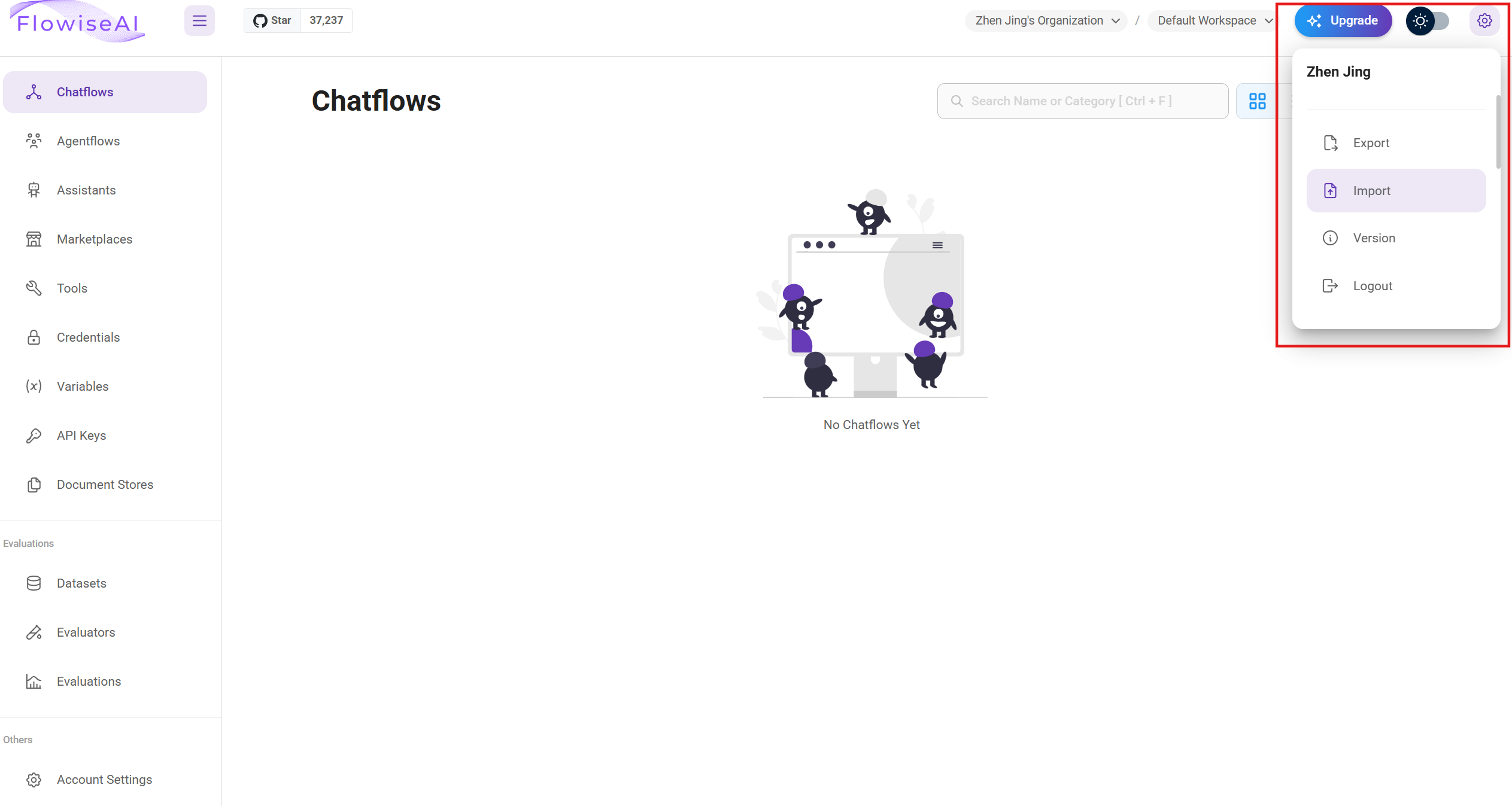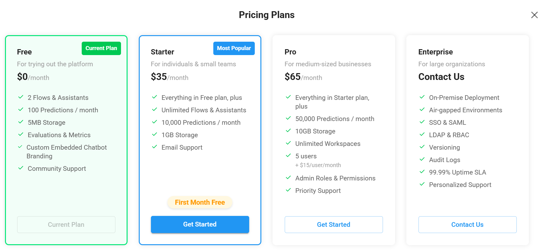 9. New user by default is on the **Free Plan** with a limitation of 2 flows and assistants (for each). If your exported data has more than that, importing the exported JSON file will throw an error. This is why we are giving <mark style="color:orange;">**FIRST MONTH FREE**</mark> on **Starter Plan** which has unlimited flows & assistants!