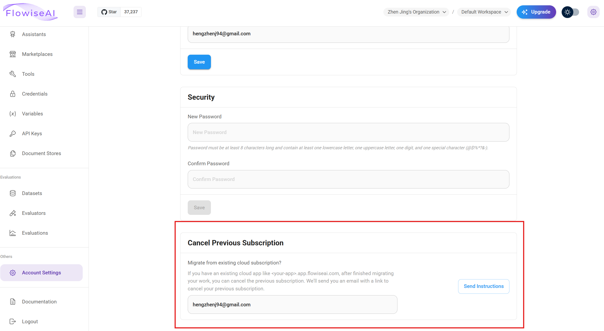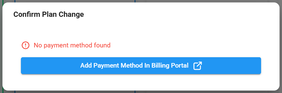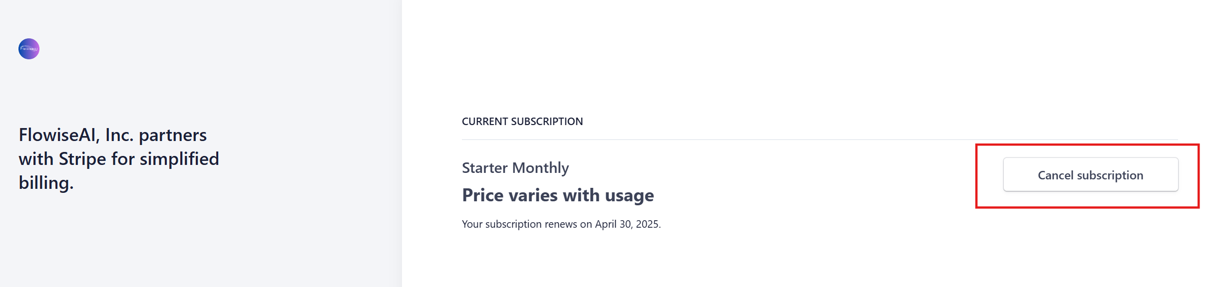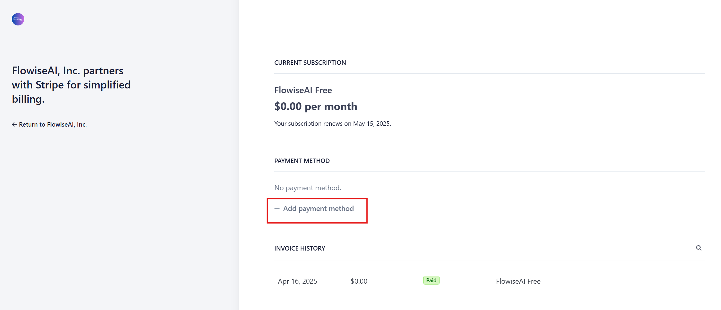 11. After added payment method, navigate back to Flowise, click Get Started on the selected plan and Confirm Change: