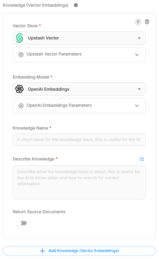 Click on the "Select Vector Store" card and choose your preferred [Vector Store](https://docs.flowiseai.com/integrations/langchain/vector-stores). In our case, as we need a production-ready option, we will select Upstash.