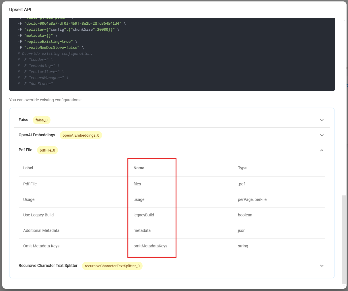 Using the image below as an example, we can override the **`usage`** parameter of the PDF File Loader like so: