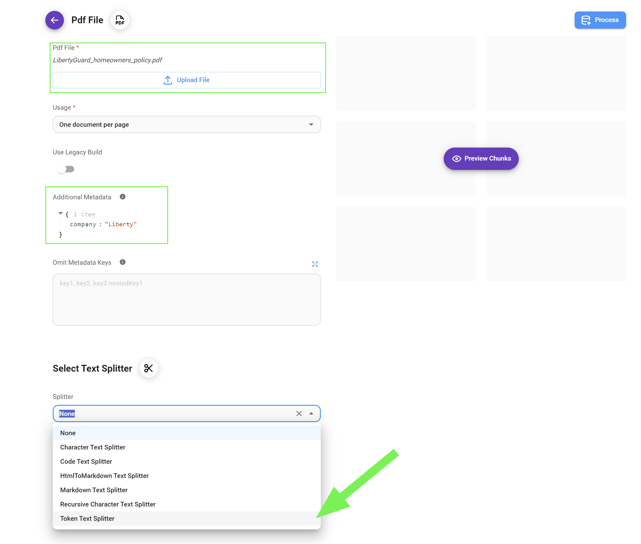 We can now preview how our data will be chunked using our current [Text Splitter](https://docs.flowiseai.com/integrations/langchain/text-splitters) configuration; `chunk_size=1500`and `chunk_overlap=750`.