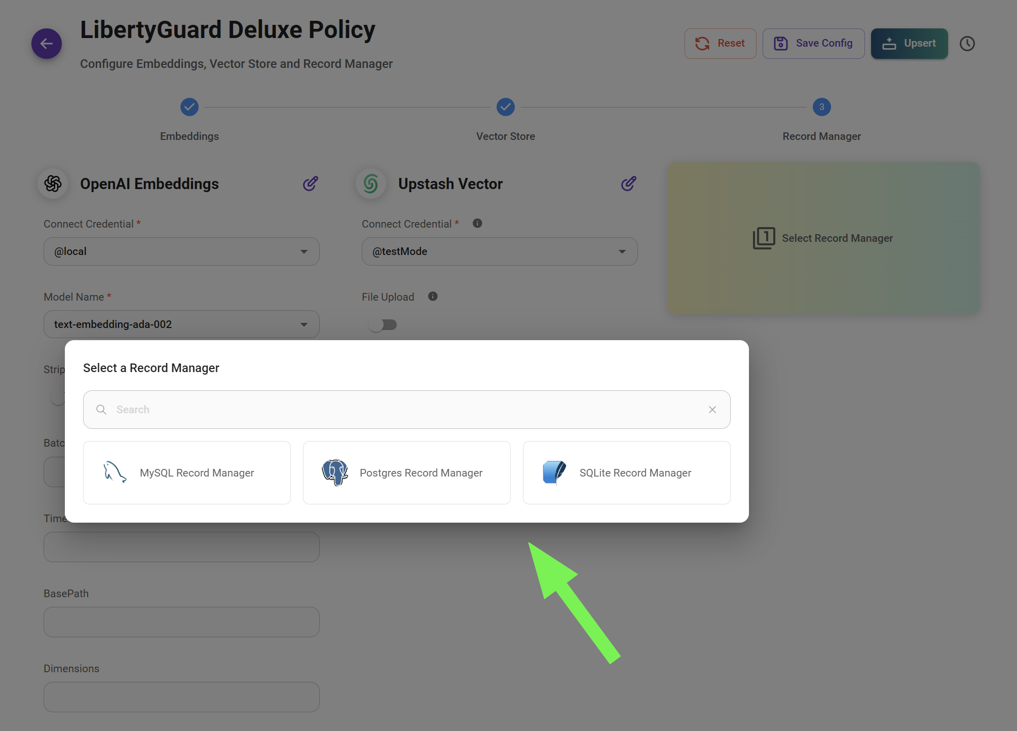 Record Manager is an optional but incredibly useful addition to our upserting flow. It allows us to maintain records of all the chunks that have been upserted to our Vector Store, enabling us to efficiently add or delete chunks as needed.