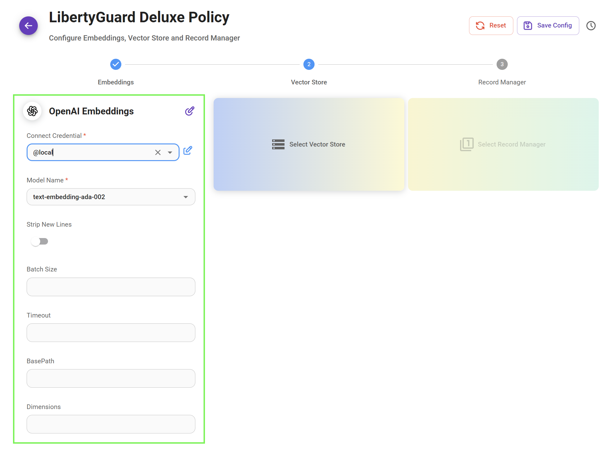 * **Vector Store:** Next, we determine the Vector Store where our dataset will reside.